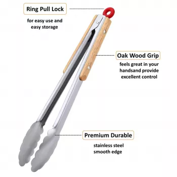 Stainless Steel Kitchen Tongs with Wooden Grips - BBQ Food Tongs